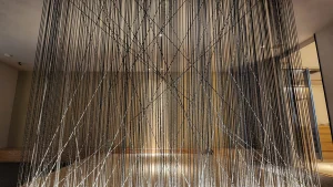In this seasonal installation, a triangular Christmas tree form is created by suspending kumihimo cords in a floating arrangement. Using the traditional Marukaragumi braid, each cord incorporates a wire and tube structure for shape and stability. Red-colored cords with scattered gold threads bring a festive brilliance to the space.