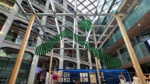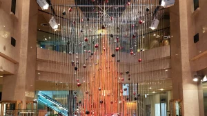 Inside the temple’s Goma Hall, a custom partition was installed using exceptionally thick 28 mm kumihimo cords. Each cord is braided around a tubular core and suspended to form a flowing pattern that merges two sacred motifs deeply connected to Shinkoji: dragon and cloud. The cords are spaced approximately 8 mm apart, allowing for airflow within the space.